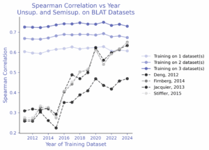 Finally, we focused on β-lactamase, the ProteinGym target with the most assays. Here, a clearer pattern emerged: zero-shot performance improved steadily with newer training data. AMPLIFY models trained on later years consistently outperformed earlier years. By contrast, semi-supervised learning told a different story: performance did not trend upward year-over-year. It remained flat. Training on one experimental dataset from 2011 matched the zero-shot accuracy of a 2020-trained model, and adding more β-lactamase datasets pushed performance beyond all unsupervised baselines.