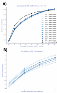 A simple linear regression on a random 10% split with AMPLIFY embeddings, consistently outperformed zero-shot, and performance improved monotonically as more labeled data was added. Surprisingly, one-hot encodings beat embeddings from every AMPLIFY model in this setup-until data leakage was addressed: random train/test splits let the same mutational positions appear in both sets, inflating performance. With leakage-controlled splits—contiguous or modulo (from ProteinNPT; Notin et al., 2023)-scores dropped sharply, especially for one-hot encodings. No year-over-year trend was observed for AMPLIFY embeddings in either the leakage-prone or leakage-controlled settings.