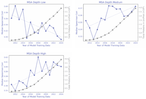 Zero-shot Spearman correlations showed no steady climb, instead fluctuating year-to-year with dips even as billions of new sequences were added. Breaking results down by MSA depth (i.e. how many related natural sequence exist in UniProt) helped clarify this pattern: generally, proteins with higher MSA depth often improved with additional data, whereas proteins with low MSA depth sometimes performed worse with newer data.