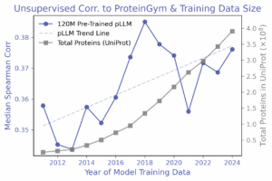 To explore whether more data has actually led to better pLMs, we turned to a new resource uniquely suited for isolating the effects of training data scale: the AMPLIFY suite of pLMs (Fournier et al., 2024). Each AMPLIFY model was trained on a cumulative yearly snapshot of UniRef100 (2011 -> 2024) using the same architecture and training setup. By holding everything else constant, the changes in performance can be directly evaluated in terms of data quantity and composition.