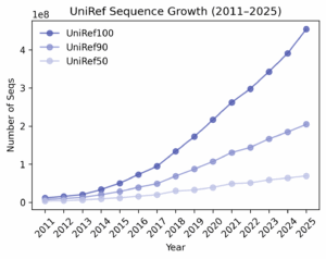 Train identical models across years (2011→2024) x cluster thresholds (UniRef30/50/70/90). For each cell, log effective diversity (e.g., Neff/L), duplication rate, and taxonomic mix. This isolates the roles of sequence diversity and recency from raw token count.